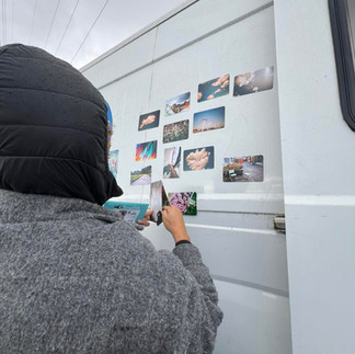 We were all cold and wet and the number of people sheltering in the psychosocial activities van prevented much art-based activity from taking place. We set up a mini exhibition inside the van and placed a series of magnetic photos on the outside, where they got only fleetingly viewed. We realised that what we could do was be alongside people in the lashing rain. As one man said while standing with his friend: ‘all I need is my friend with me and that makes things feel a little better.’