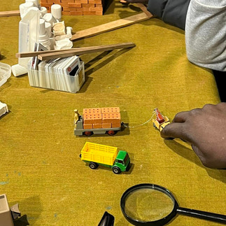 This afternoon in the day centre @calais.exilessc The Community Table was used to the full. In discussion with the coordination team we were located in a new position in the main space. Collectively we activated the table by first using the materials ourselves. Knowing to trust the process, more than 40 teenage boys and men slowly found their way to the table, enjoying the crisp detail in the slides through the retro viewers, carefully constructing miniature buildings and little home scenes, lining up and revving up the toy trucks - everyone sitting side by side around the table. It was heartwarming to see how engaged people were in play.